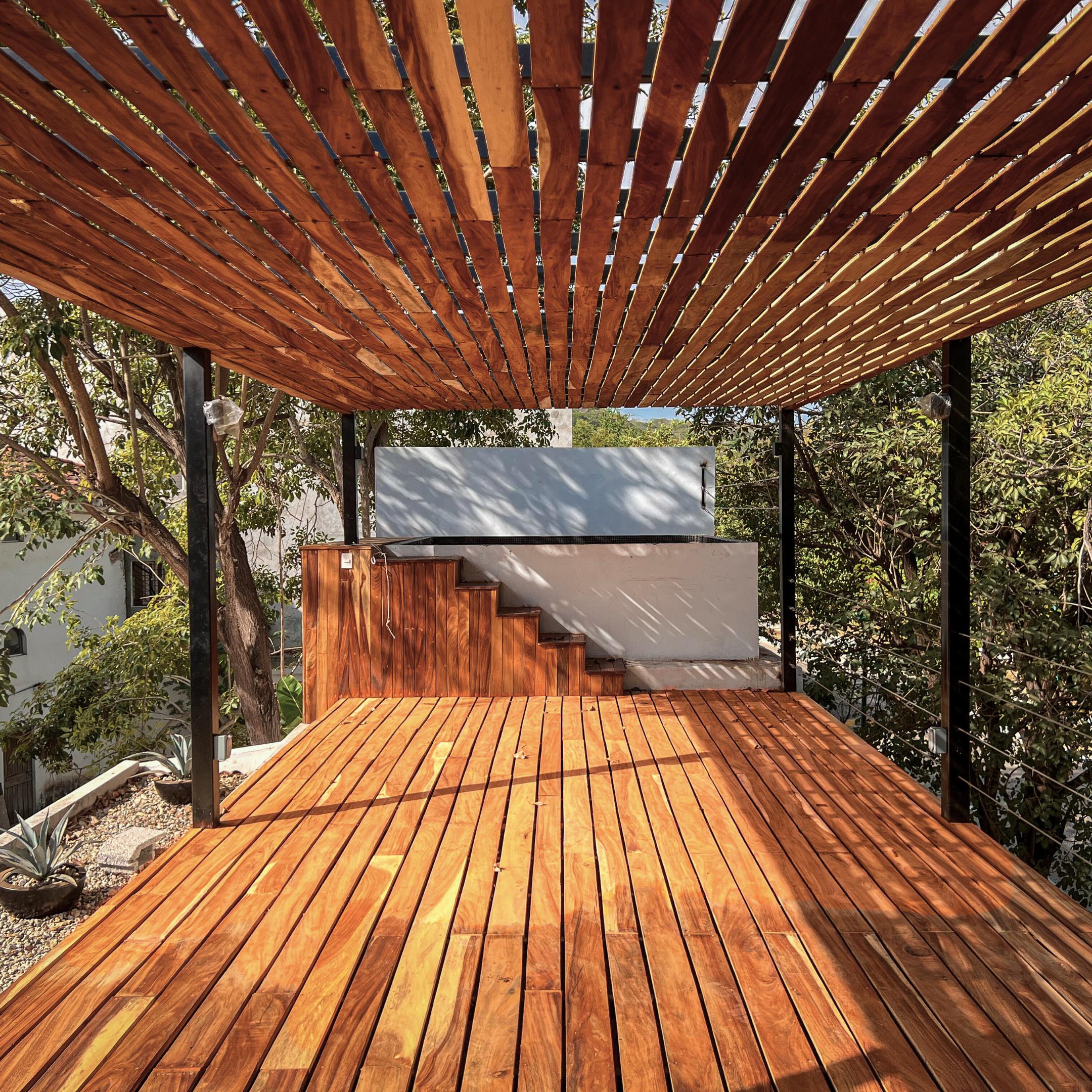 La terraza de la zona común es una gran zona para descansar y relajarse. Con su decoración de madera y su diseño simétrico, la terraza cuenta con una pequeña zona de bar, así como una piscina de inmersión/jacuzzi para relajarse.